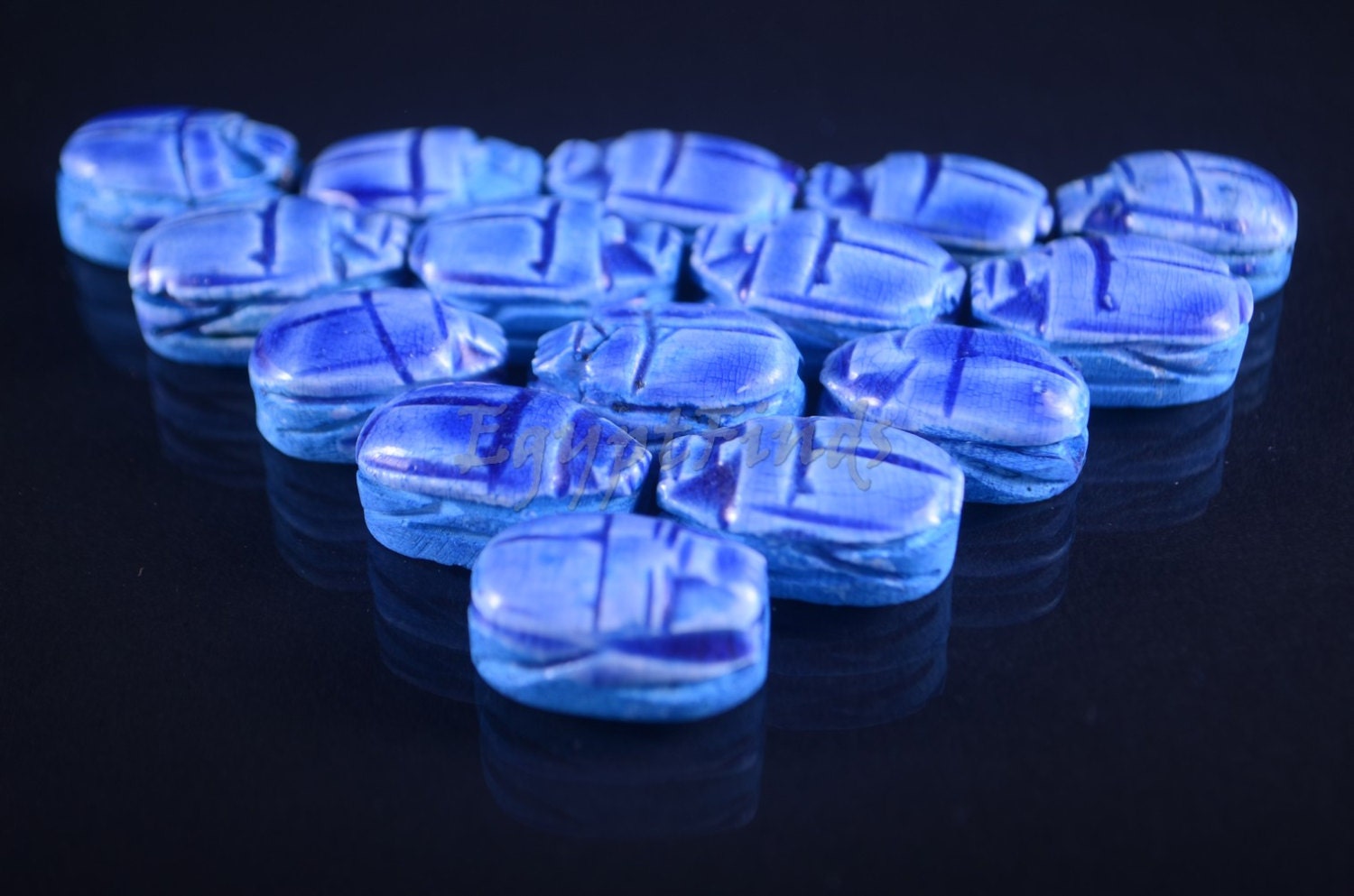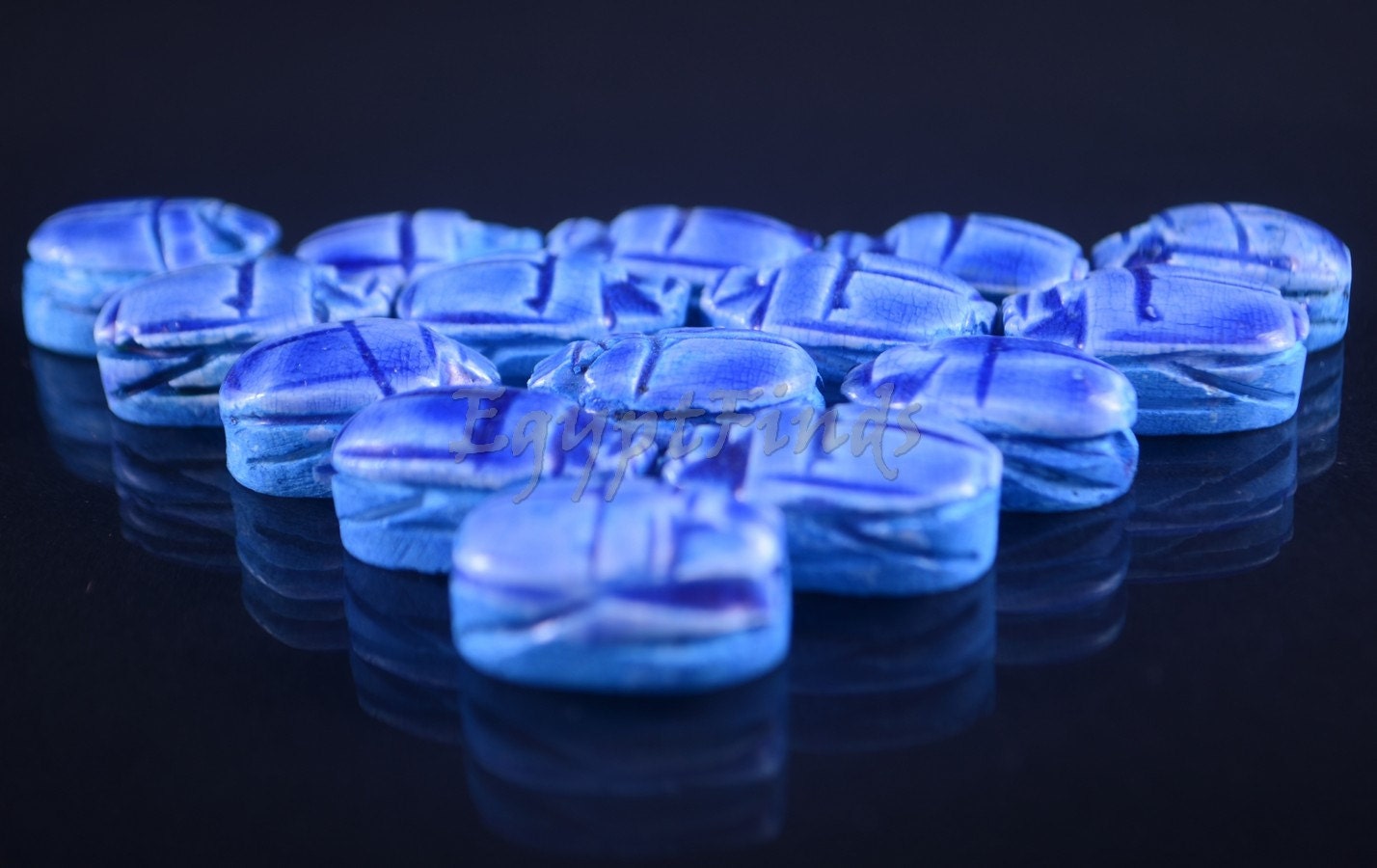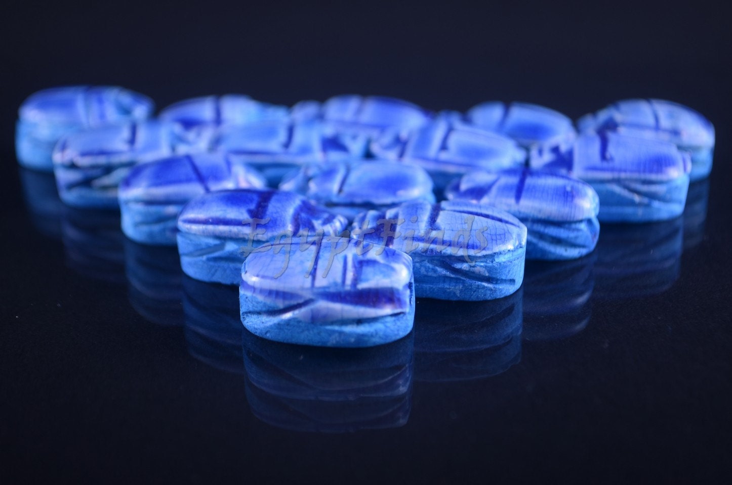 15 Egyptian Blue Ceramic Hand Made Carved Luck Scarabs With Hieroglyphic
