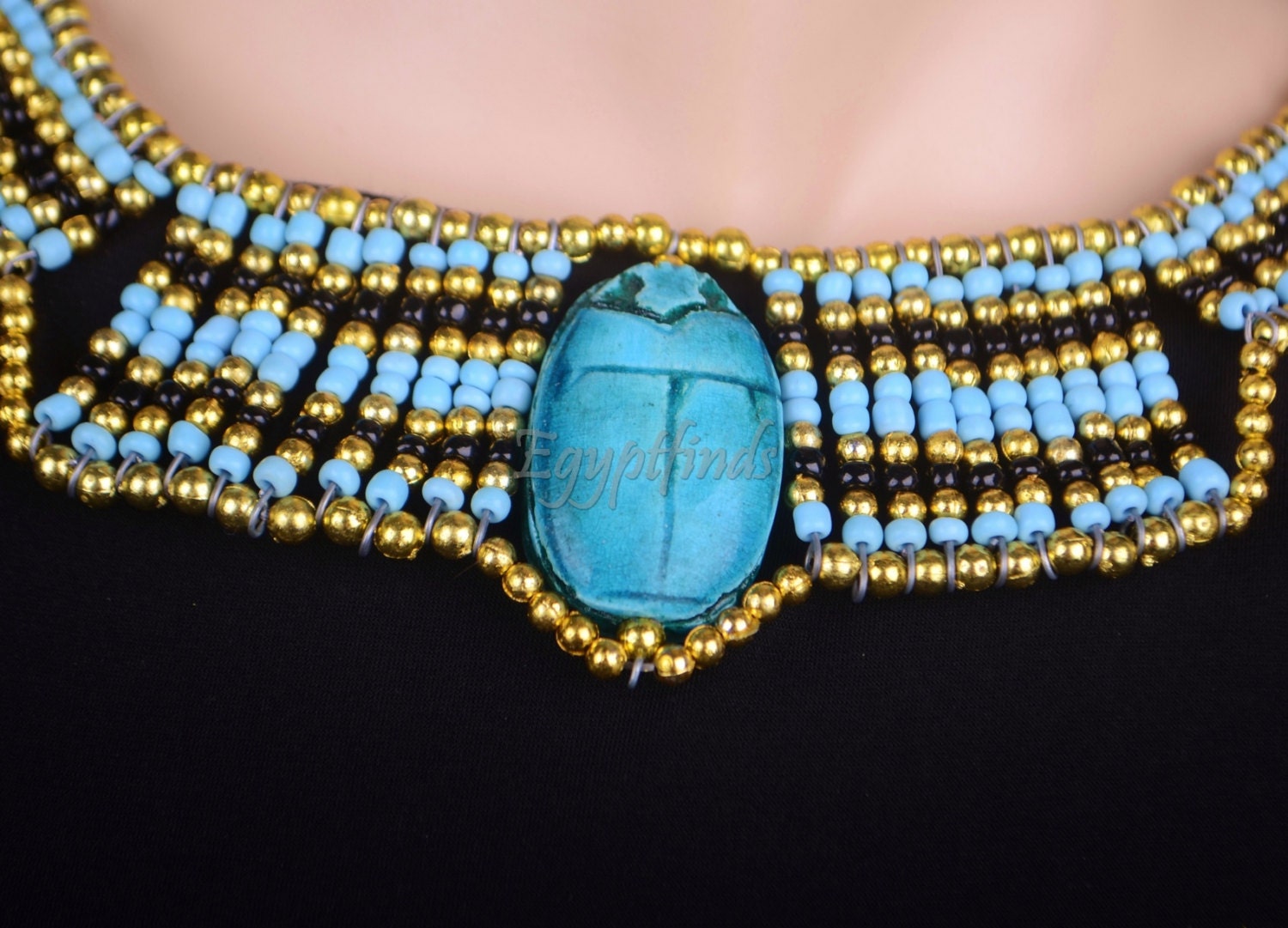 Egyptian Beaded Cleopatra Large Scarab Necklace Collar