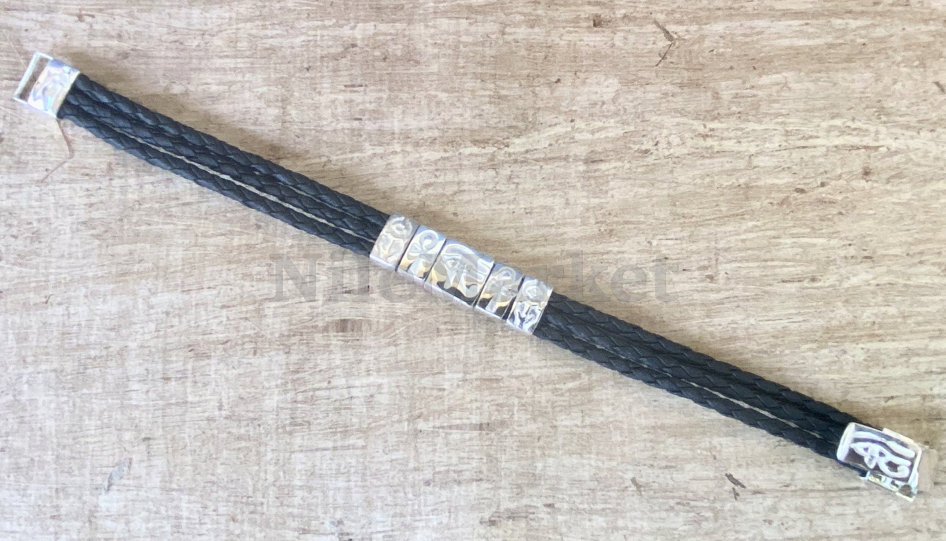 Sorry We donot Ship to Spain And Australia .... Personalized ancient Egyptian Silver Themes Charms In Black Leather braided woven Bracelet .made from high grade quality sterling silver. Excellent for a male or female and looks simply stunning.Would make an excellent gift your lover.