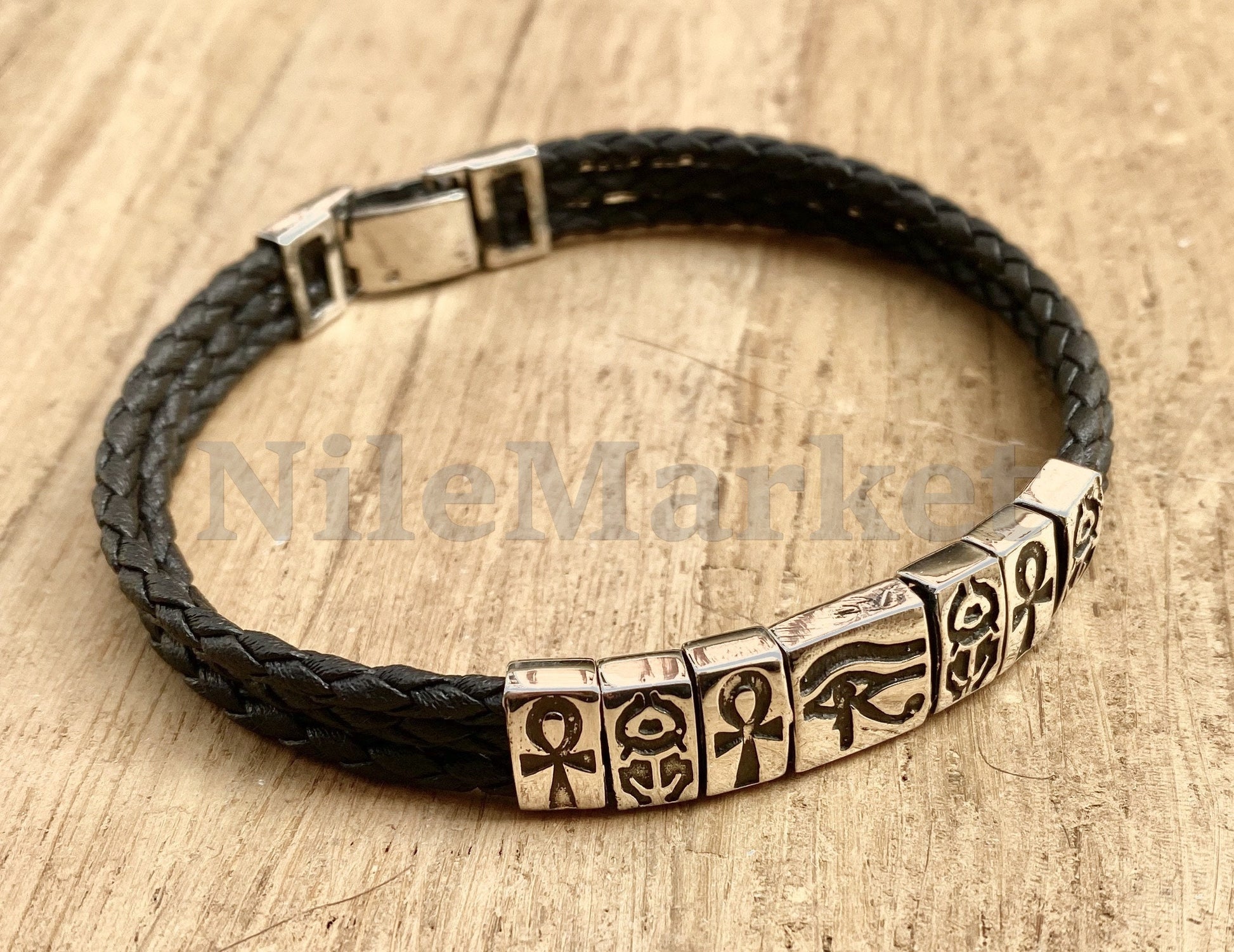 Egyptian Customized Personalized Sterling Silver ankh scarab eye of horus leather bracelet Gift for Her gifts for him, men's jewellery