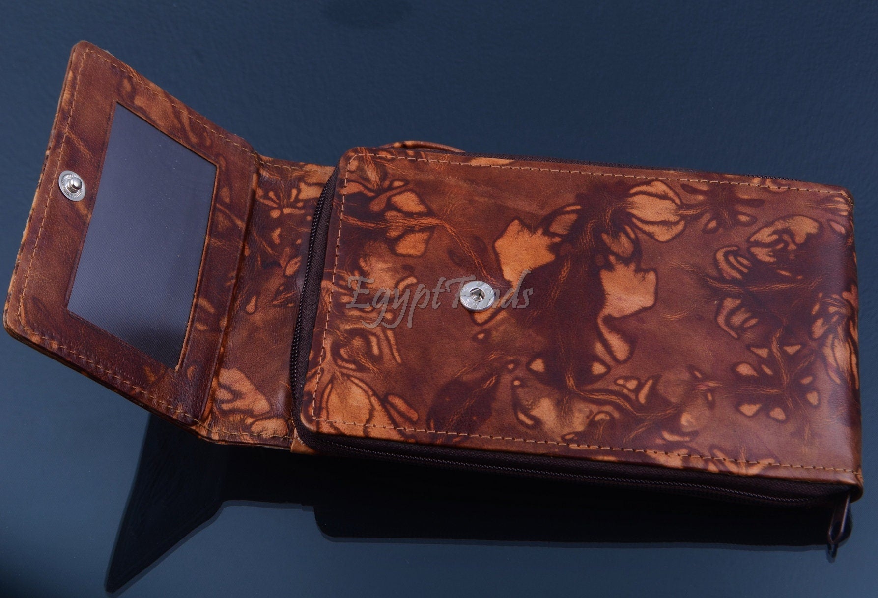 Sorry We donot Ship to Spain And Australia .... This is a nice wallet handmade in Egypt from quality grade leather. The outside of this Wallet have Tut ankh Amun On one side and pyramids scene on the other side embossed in , the zippered wallet features checkkbook cover ,leather insert ,Lots of compartments for bills, credit cards, business cards , coin and ID, This is a unique and special wallet sure to gain attention when you pull it out at the cash register. Would make a fantastic gift .comes from smoke free and pet free place.