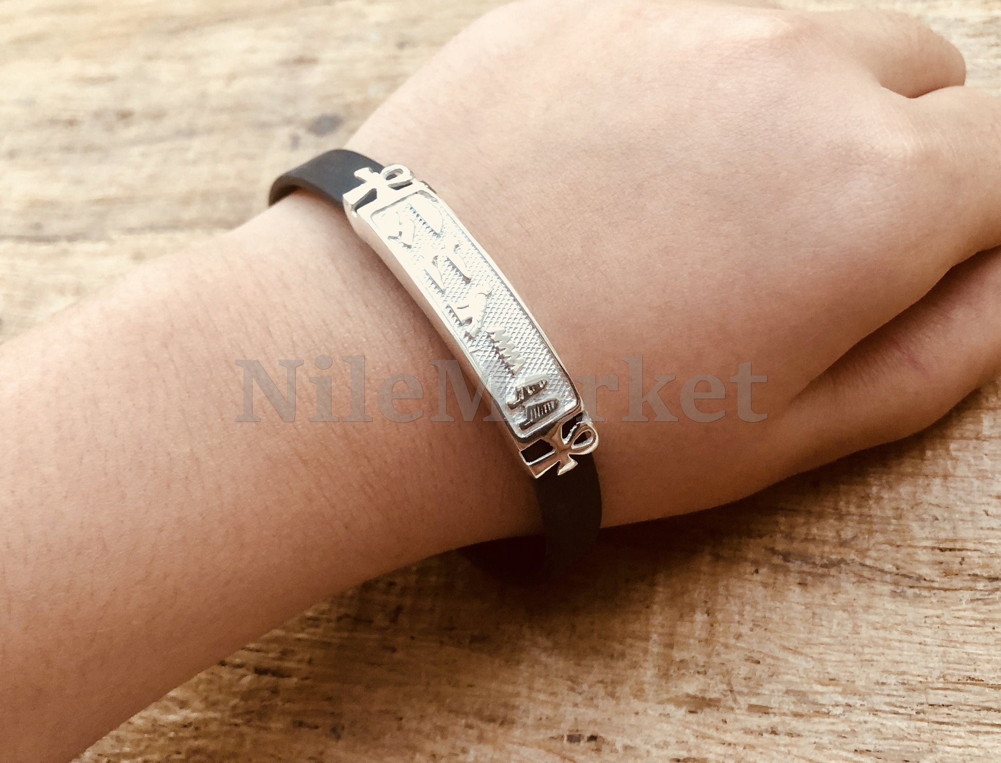 Sorry We donot Ship to Spain And Australia .... Get your name in ancient Egyptian Hieroglyphics on this pretty sterling silver Large Cartouche In Black Leather Bracelet .made from high grade quality sterling silver. Excellent for a male or female and looks simply stunning,Comes In Gift Pouch.Would make an excellent gift your lover.