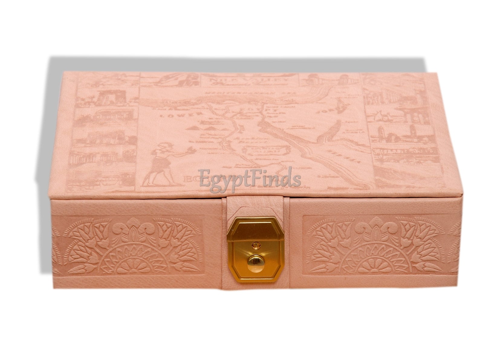 Sorry We donot Ship to Spain And Australia .... This is a unique box excellent to keep your trinkets and treasures. Perfect for either male or female. The box features lots of beautiful ancient egyptian imagery on the top embossed. The sides of the box has lotus flower imprint. Inside the box is lined with beautiful blue velvet, lots of divided compartments and 1 tray. Box has a lock and key for ultimate privacy. This is a wonderful gift idea this holiday season.comes from smoke free and pet free place.