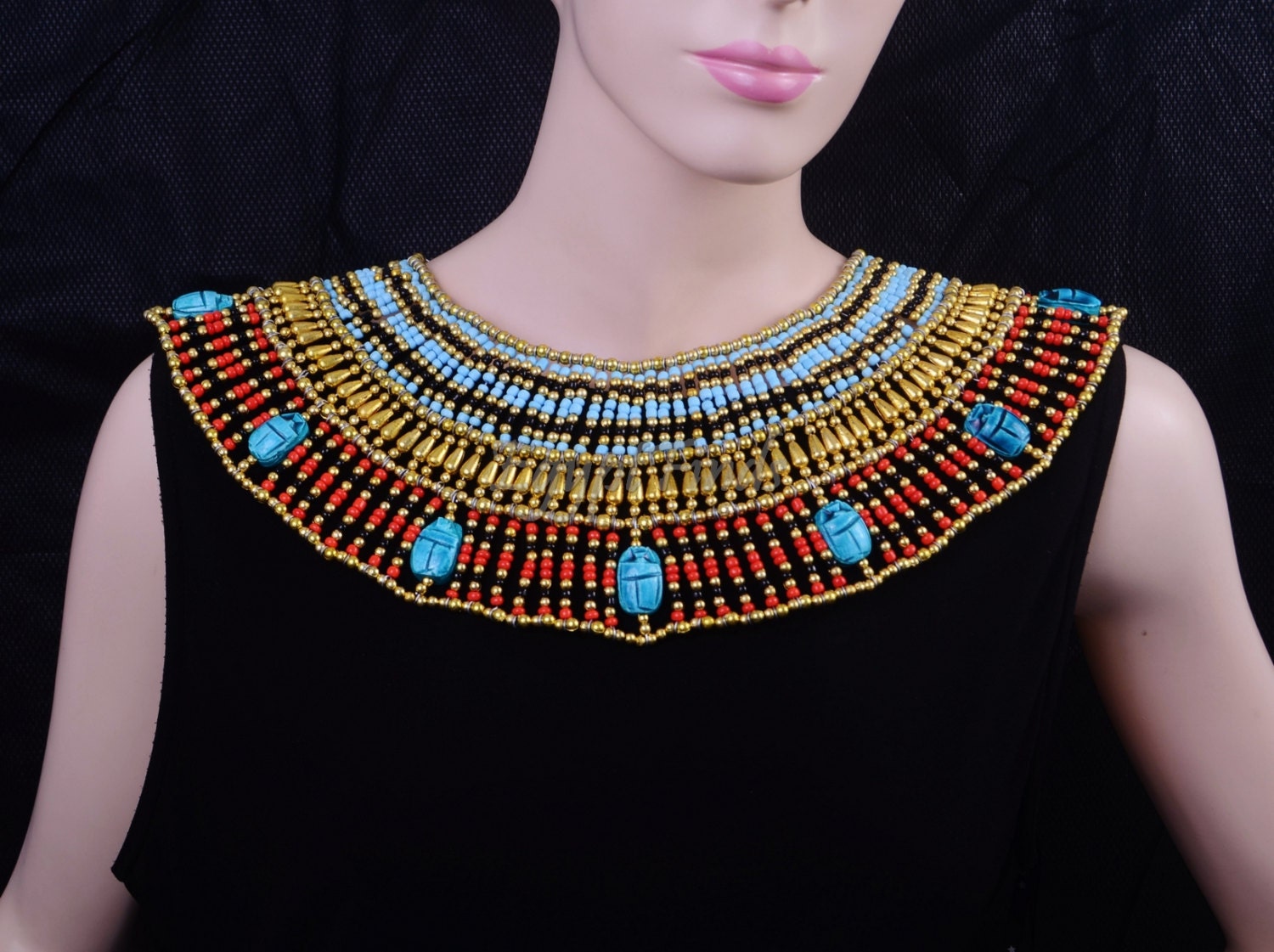 Lovely Ancient Egyptian Beaded Cleopatra 9 Scarabs Necklace Collar