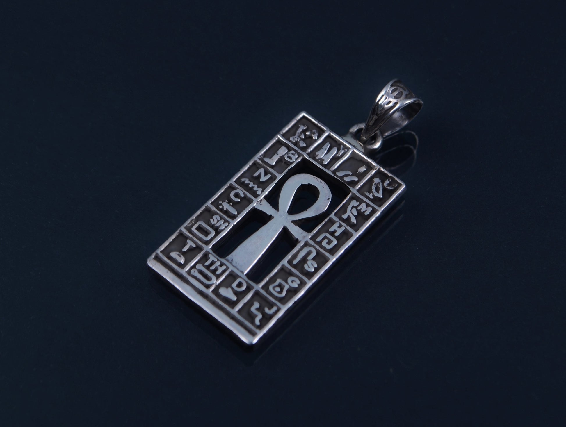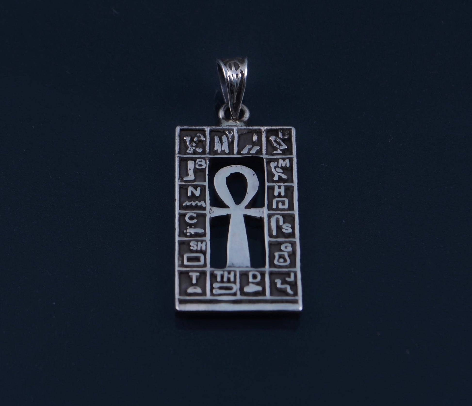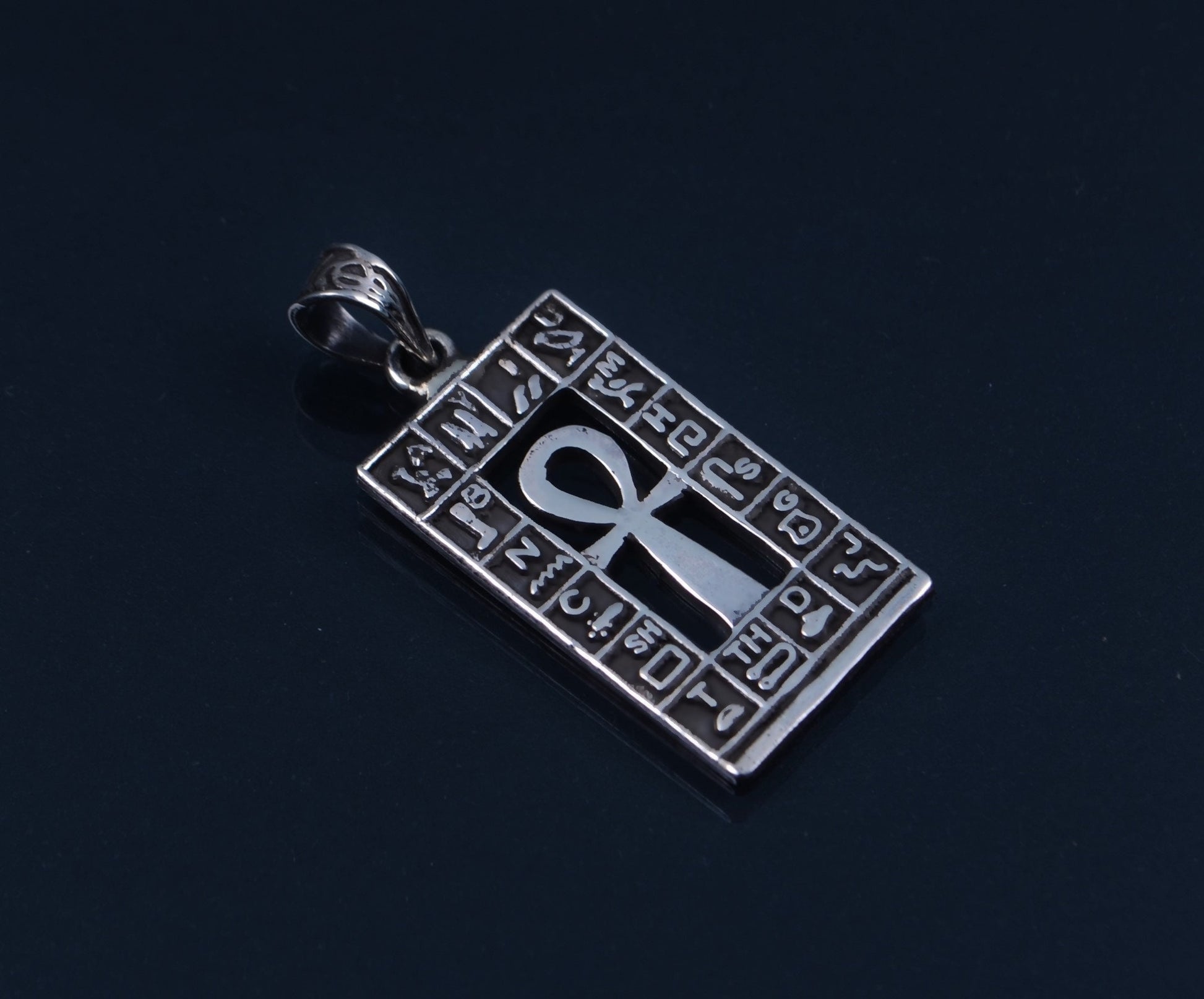Lovely Egyptian Sterling Silver Hieroglyphics Framed Ankh life key Cross Pendant Charm