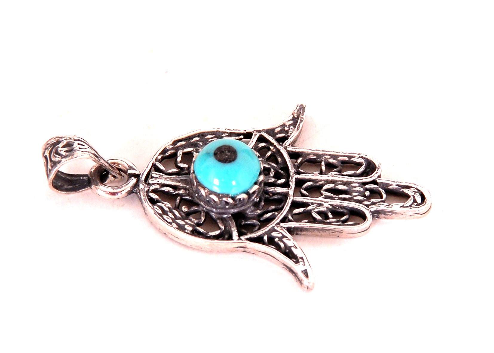Sorry We donot Ship to Spain And Australia .... The charm is a filigree silver Hamsa hand (folklore protection symbol) with a lovely turquoise bead Eye in the center. This is quite lovely and a true Egyptian Tribal work of art