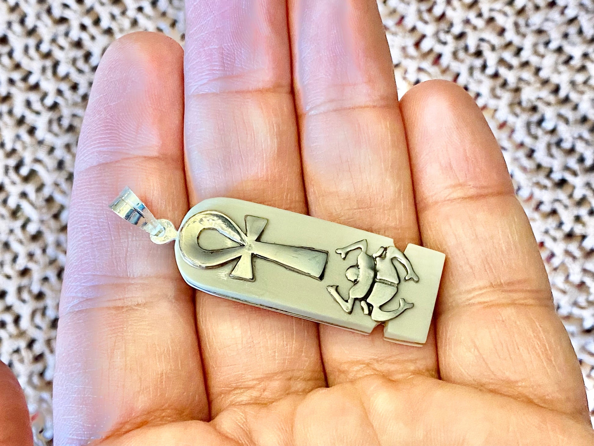 Unique Sterling silver & Camel bone Ankh and Scarab Sterling Silver Charm Cartouche Egyptian Jewelry Key Of Life and Scarab Pendant