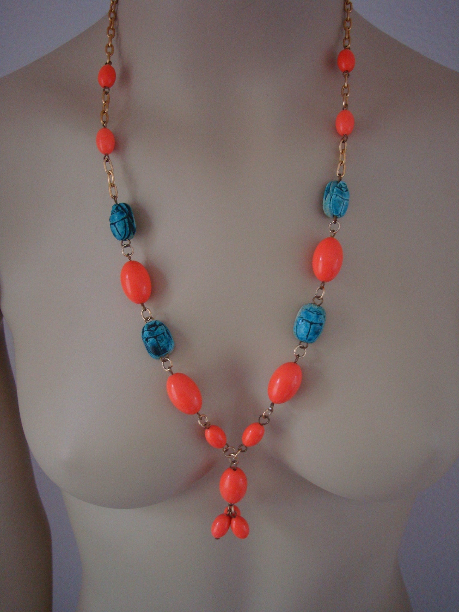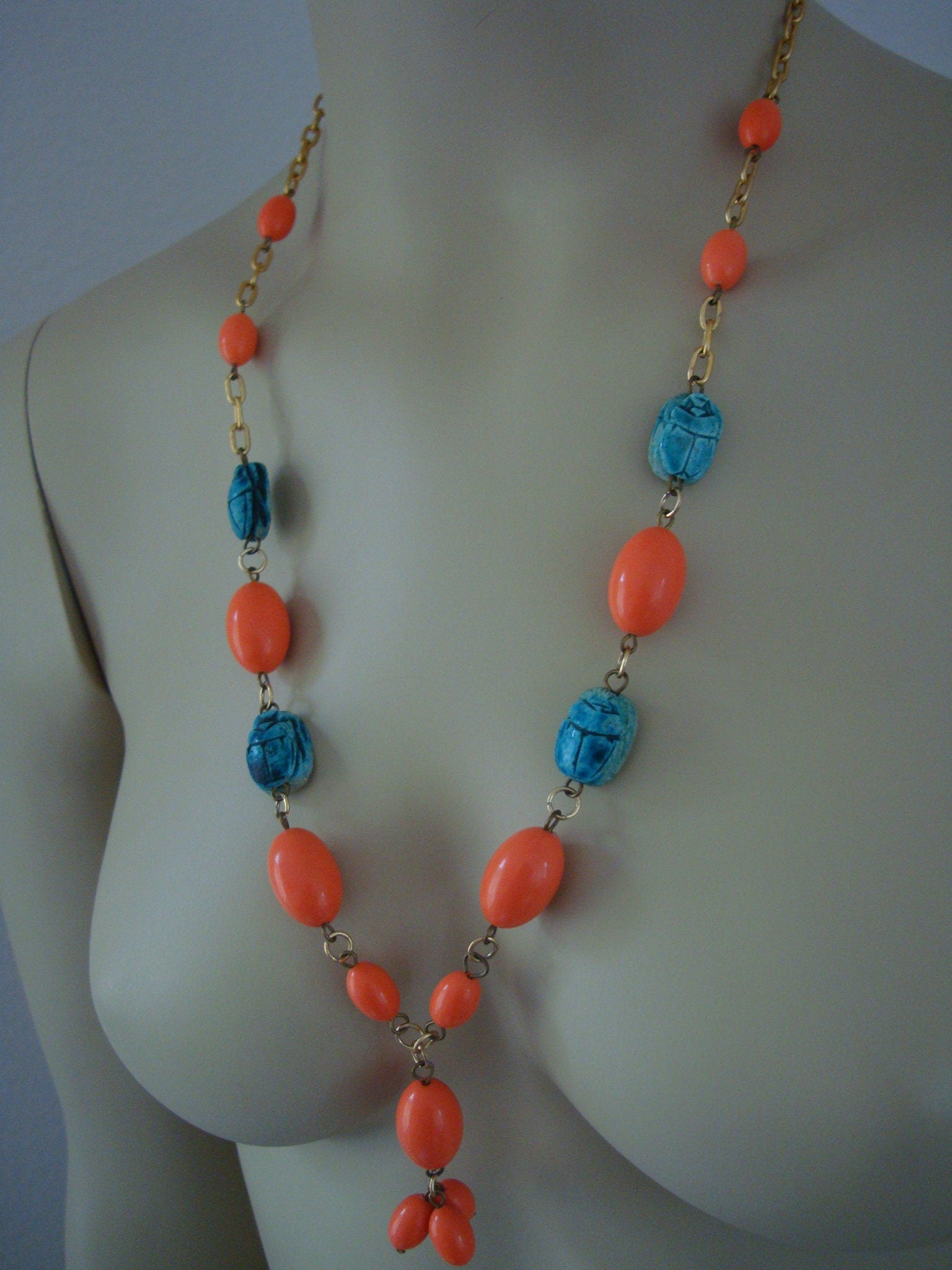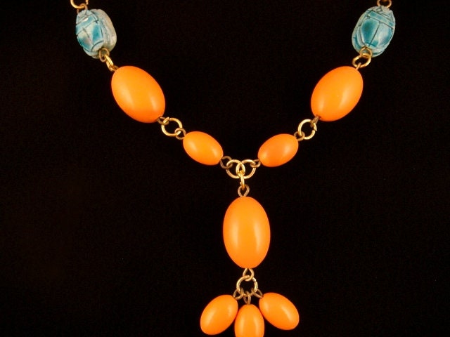 Sorry We donot Ship to Spain And Australia .... THIS NECKLACE CONSISTS OF ORANGE OVAL BEADS AND TURQUOISE BLUE SCARABS ON A CHAIN LINK NECKLACE. THIS IS QUITE UNUSUAL, AN OLD STYLE WHICH IS NO LONGER MADE. THIS WAS MADE IN EGYPT BY HAND AND IS QUITE AN INTRIGUING PIECE OF EGYPTIAN JEWELRY.